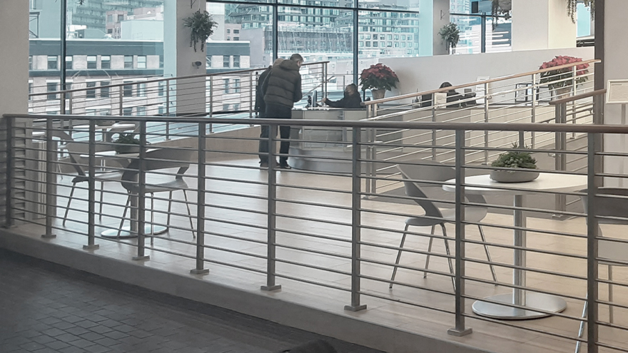 Railing System: AGS’ Olympus System – Stainless Steel Horizontal Bars and Top Mounted Posts with Wood Top. SLCE Architects, LLP. Contractor: REDCOM CM Jeremy Tucker.